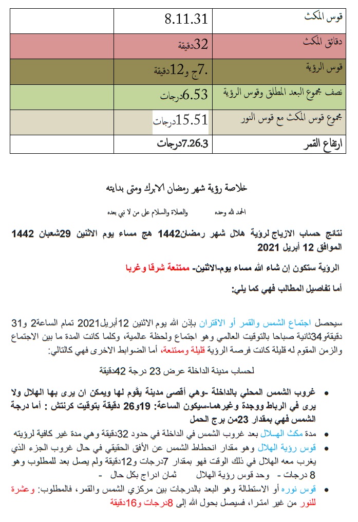 Le mois de Ramadan 2021 selon les calculs, débutera au Maroc mercredi 14 avril. La veille, le mardi 13 avril, l’observation du croissant lunaire sera possible sur l’ensemble du Maroc et même sur la majeure partie du globe terrestre.