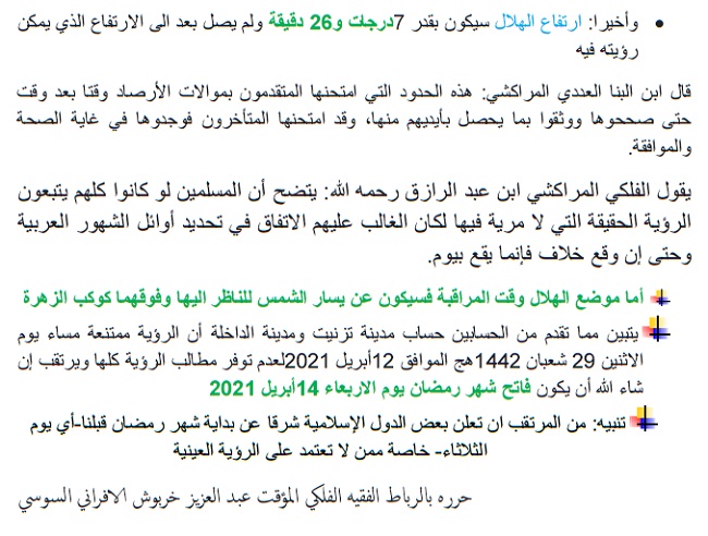 De ce fait, le 1er jour du mois de Ramadan 2021 / 1442 sera le mercredi 14 avril.