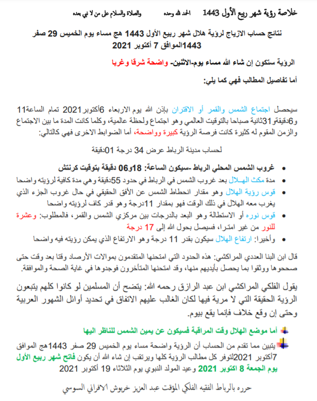 La nouvelle lune du mois de Rabie Al Aoual 1443/2021 sera visible le soir du 29 Safar 1443, correspondant au 7 octobre 2021 au Maroc.