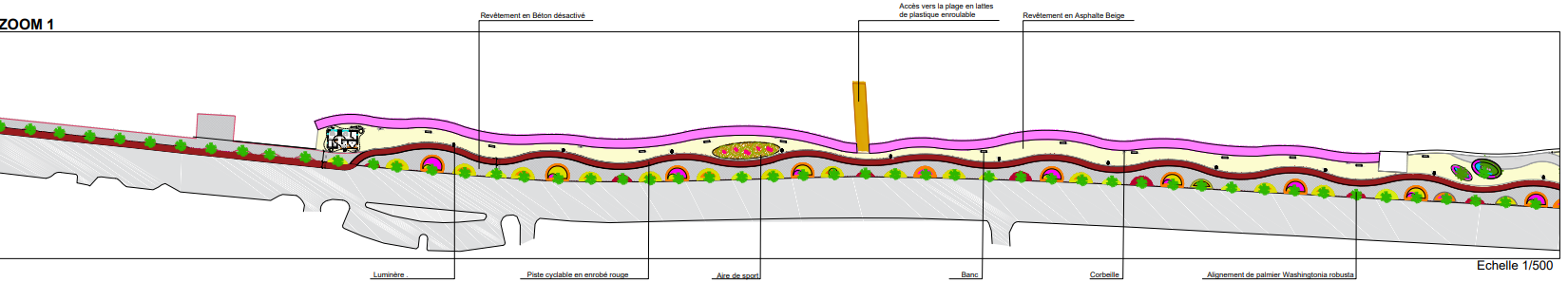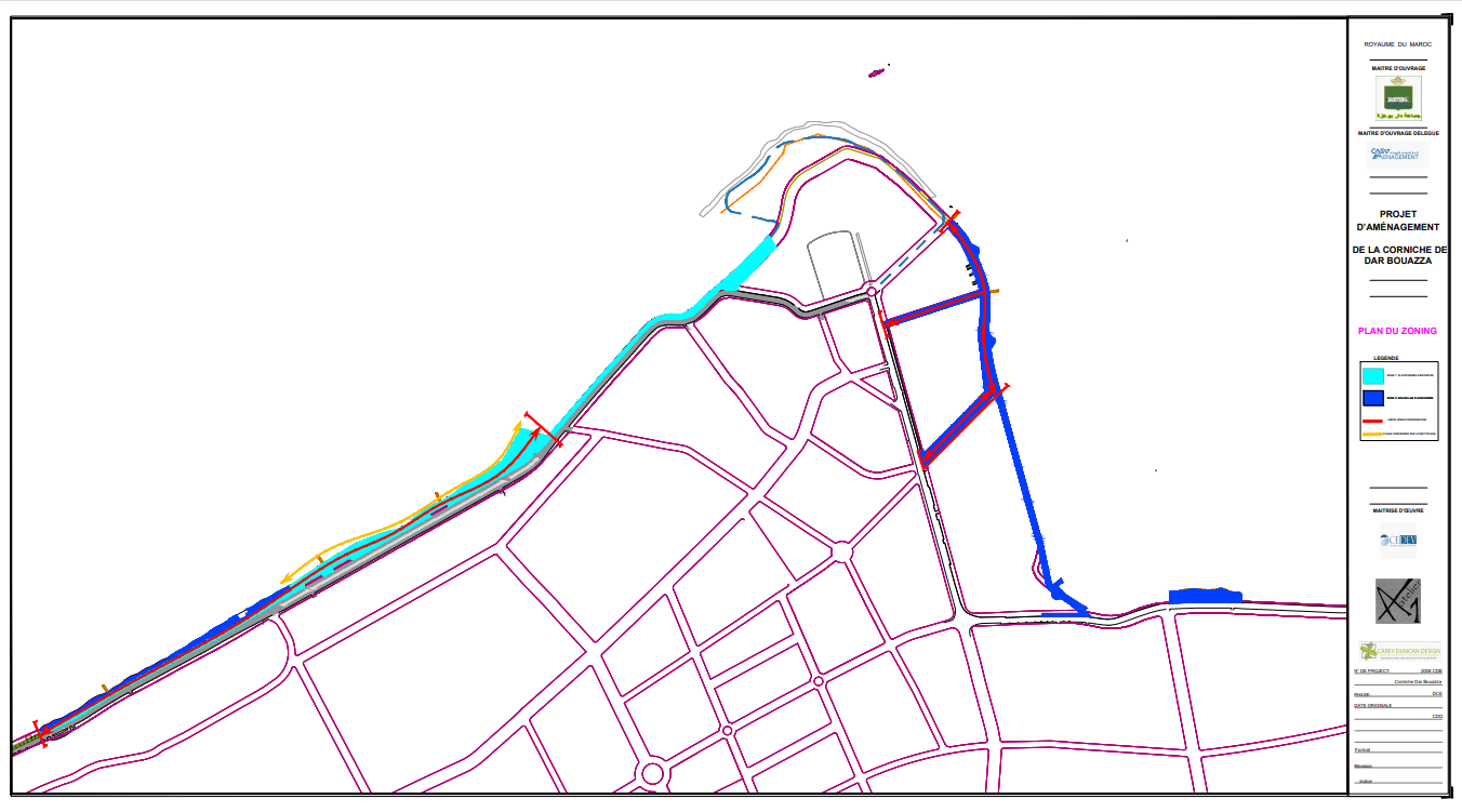 Selon les documents du projet, consultés par nos soins, l’on constate que la SDL va intervenir sur plusieurs zones de la corniche. La couleur bleu ciel, sur l'image ci-dessous, correspond à la plateforme existante qui sera réaménagée, tandis que la couleur bleu foncé correspond à la nouvelle plateforme qui sera mise en place.