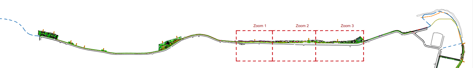 Plan paysager de masse de la seconde zone d'intervention. Cette partie correspond à la zone indiquée en bleu ciel, à gauche, sur le plan général de zoning ci-haut.