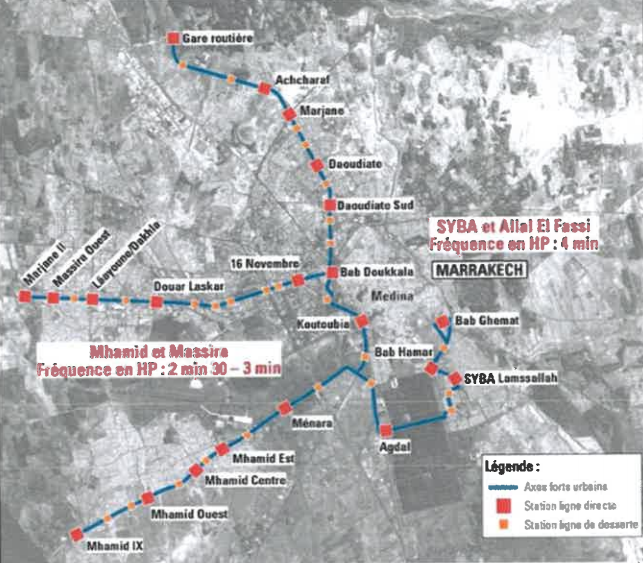 Dans le cadre du Plan de déplacements urbains (PDU) de Marrakech, les autorités ont fait le choix, en 2009, d’un scénario volontariste de développement des transports collectifs, axé sur le BHNS en tant que moyen de transport de masse, afin de pourvoir la métropole des facteurs de mobilité permettant aux citoyens et résidents de se déplacer en toute simplicité, sécurité, rapidité et au moindre coût.