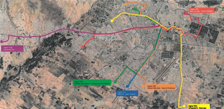 - La ligne T5 : d'environ 19,4 km, elle relie Bab Ghmat à la gare routière Al Azzouzia, en passant par Syba, Jemaâ el Fna, Koutoubia, Bab Doukkala et le quartier industriel Sidi Ghanem.