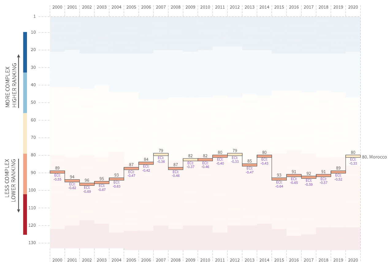 Les dernières données disponibles sont celles de 2020. Le Maroc y est classé à la 80e place au niveau mondial avec un ECI de [-0,33], réalisant un bond de neuf places, puisqu’en 2019, il était classé à la 89e place avec un score de [-0,52]. Dans ce classement, la Tunisie est classée 44e, l’Egypte 70e et l’Afrique du Sud 70e. Le top 5 du classement est constitué respectivement du Japon, de la Suisse, de l’Allemagne, de la Corée du Sud et de Singapour.