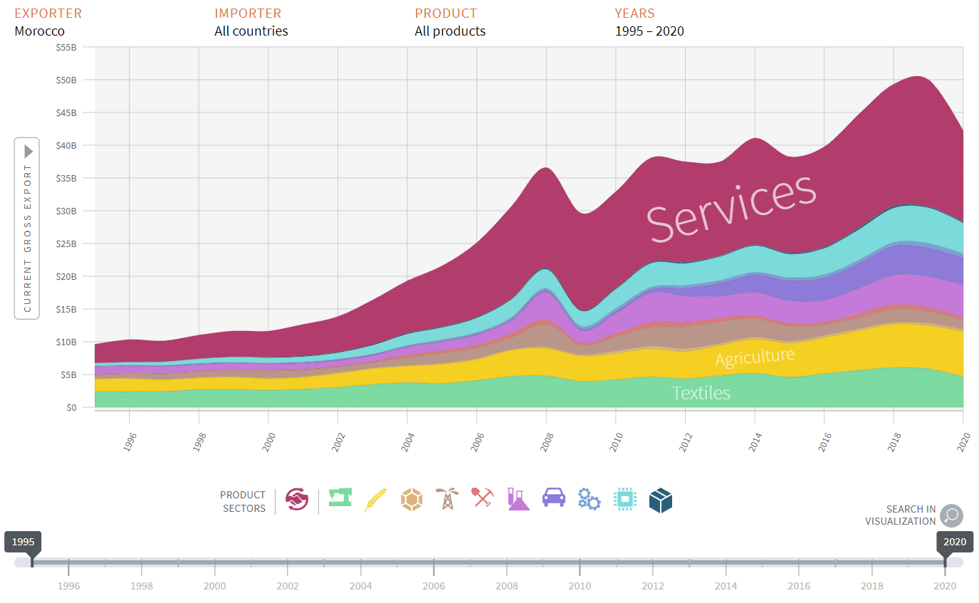 Au cours des deux dernières décennies, le montant des exportations des services, des véhicules et de l’agriculture a augmenté, alors que celui du textile, qui figurait à la fin des années 1990 parmi les secteurs les plus exportateurs, a relativement stagné.