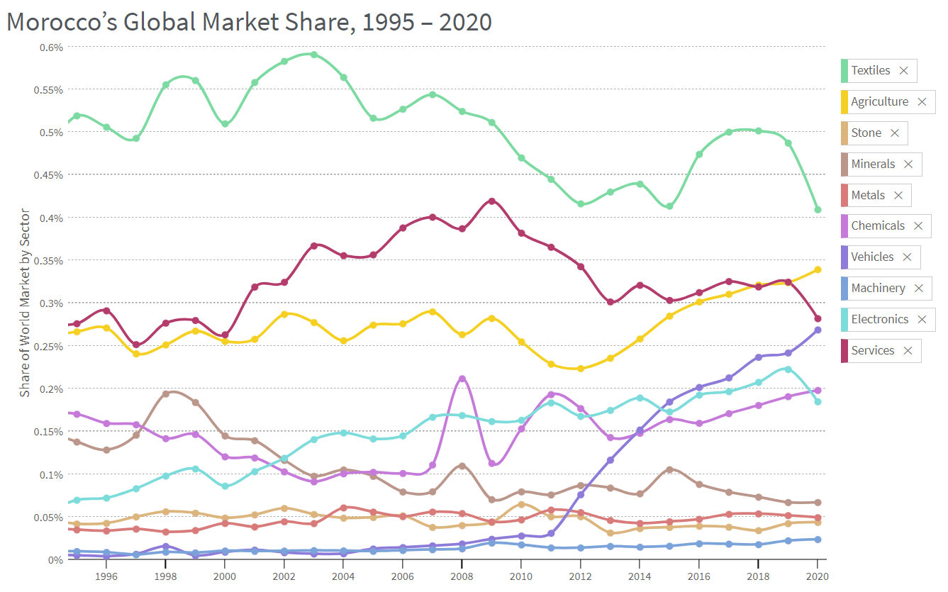 En termes de parts de marché mondiaux et sur la même période, la hausse la plus remarquable est celle des exportations de véhicules. Le Maroc est en effet passé de quasi 0% à plus de 0,25%, tandis que le textile a enregistré la baisse la plus impressionnante, allant de 0,6% du marché mondial en 2003 à 0,4% en 2020.