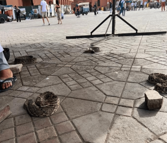 Différentes espèces de serpents, pour certaines très venimeuses, sont également exploitées par les charmeurs de serpents pour divertir les touristes. Ces serpents sont généralement capturés entre les mois d’avril et d’octobre, notamment dans le Sud-Ouest marocain, où plus de 27 espèces existent.