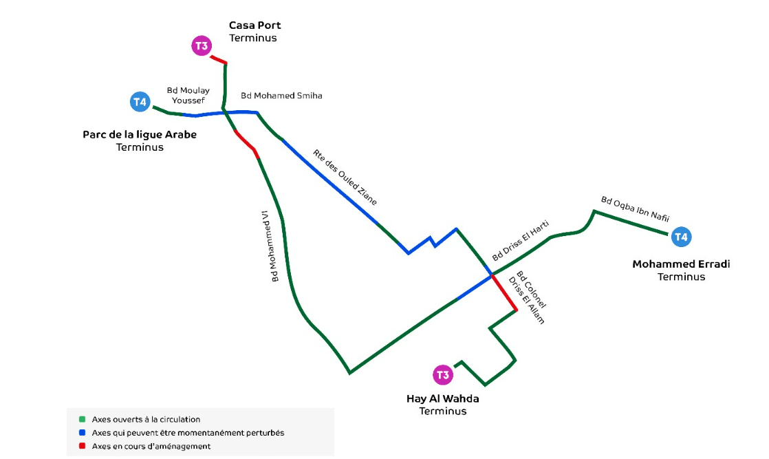 - T4 : bd Moulay Youssef, bd Allal El Fassi, rue Capitaine Puissesseau jusqu’à route des Oulad Ziane, av. des Forces Auxiliaires, av. Driss Allam jusqu’au bd Mohamed Bouziane, av. Driss Harti, bd Okba Ibnou Nafiaa.