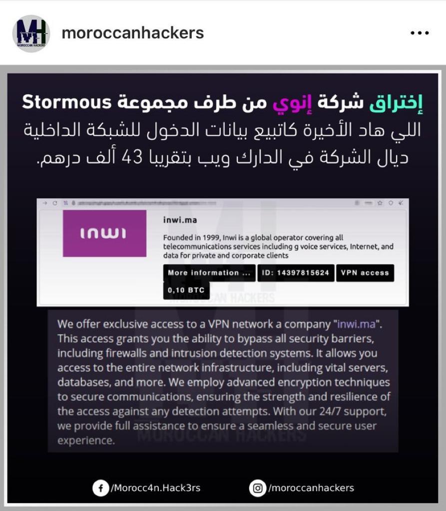 #Morocco 🇲🇦 - Stormous #ransomware group claims to be selling unauthorized VPN #access to inwi