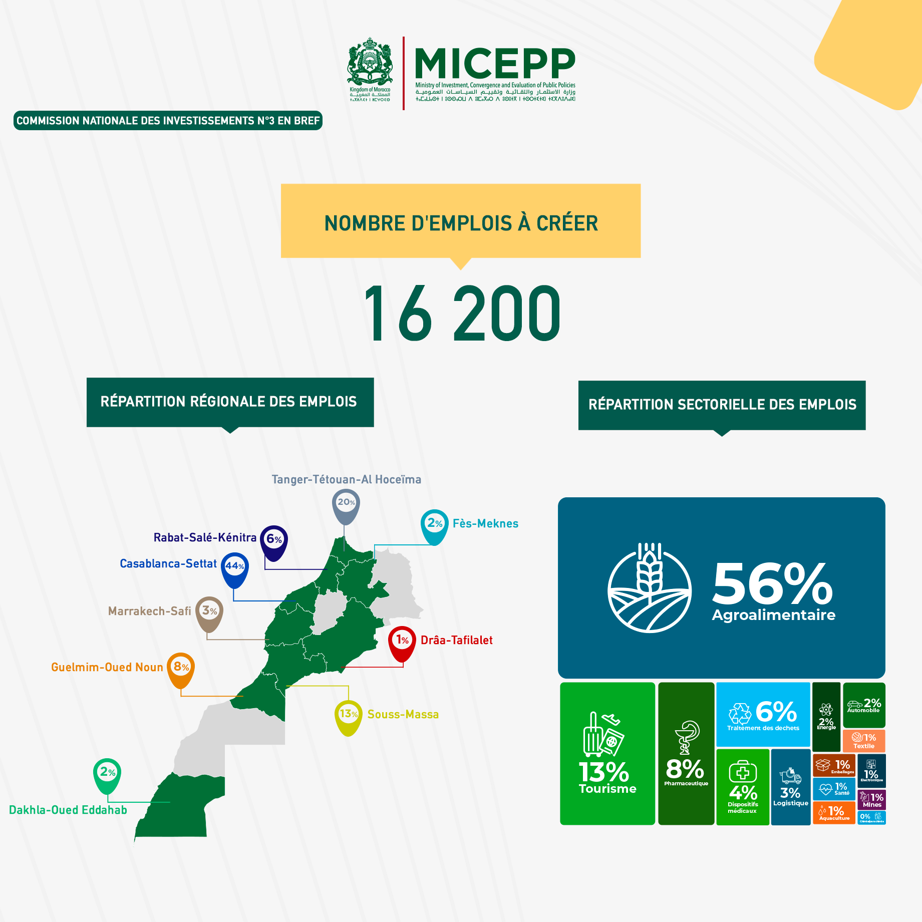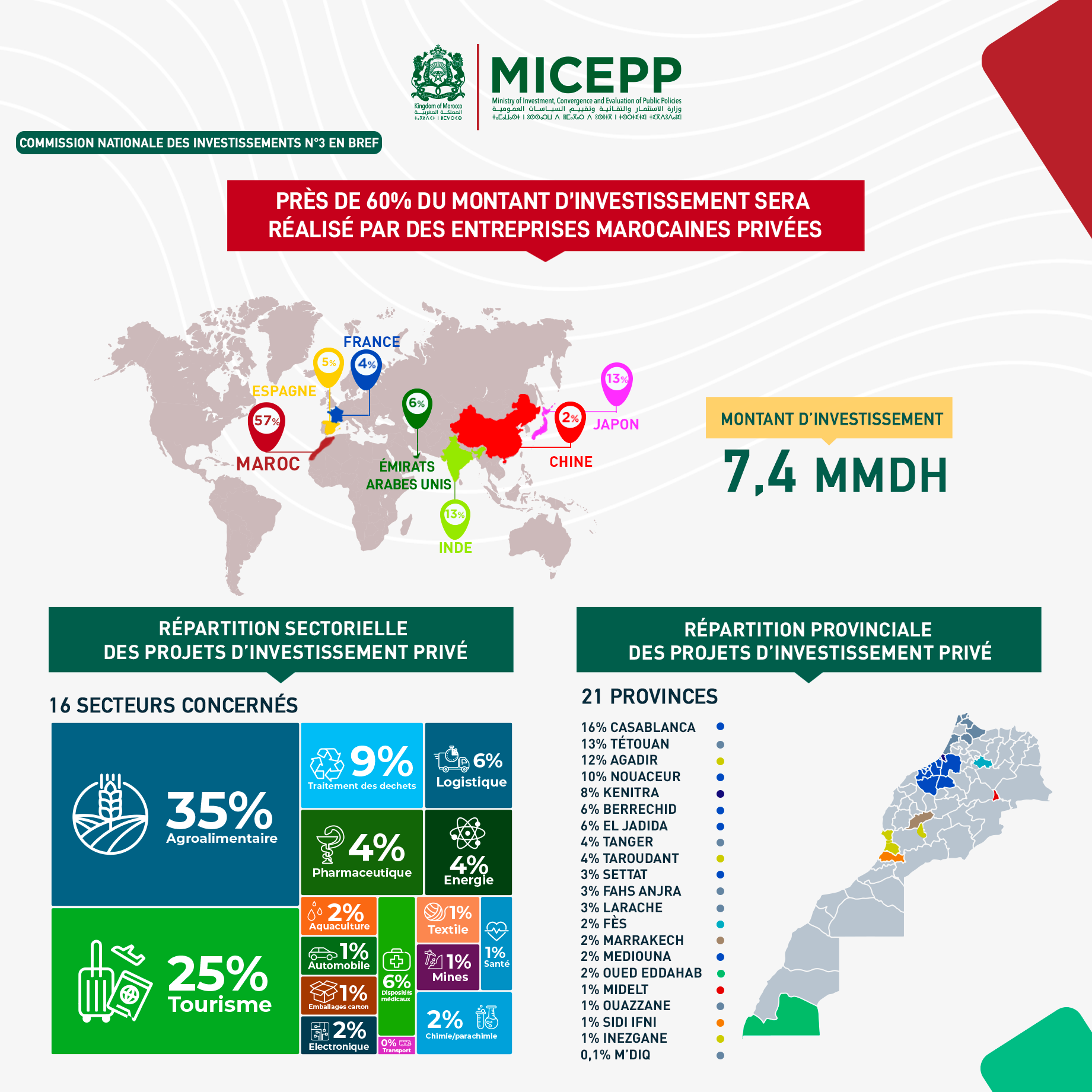 Lors de cette dernière commission, 42 projets ont été approuvés pour un montant d’investissement de 7,5 MMDH, avec 16.000 emplois directs et indirects à la clé. Au total, 60% de l’investissement est porté par des Marocains.