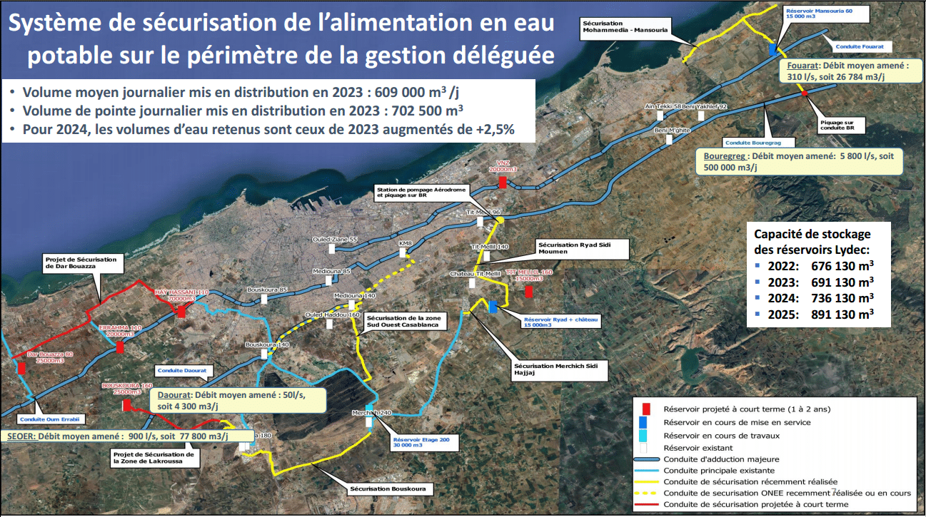 La carte ci-dessous montre l’avancement de ce projet. "Le wali de la région de Casablanca-Settat suit de près les contraintes techniques que les équipes rencontrent sur le terrain, pour une mise en service avant le mois de juin 2024, afin d’alimenter la totalité de la ville à partir du bassin de Bouregreg."