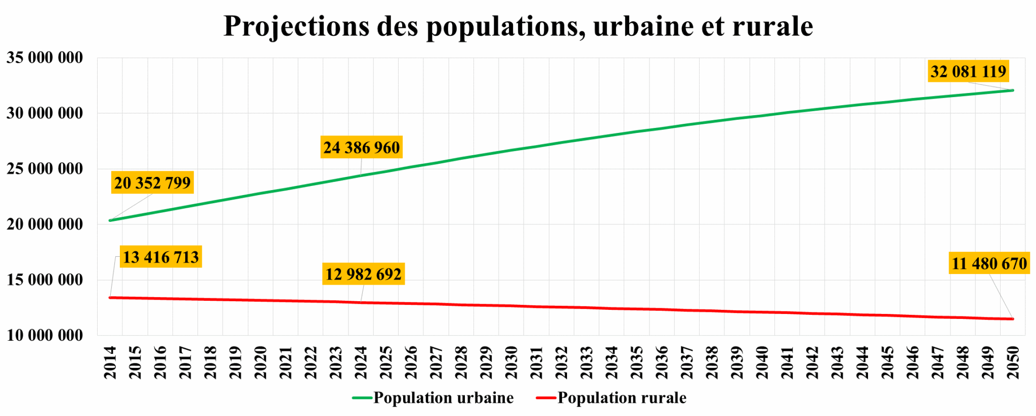Les projections du Centre d’études et de recherches démographiques (CERED) montrent que l'écart entre les populations rurale et urbaine, qui était de 7 millions en 2014, est passé à 12 millions en 2024 et pourrait atteindre 21 millions en 2050.