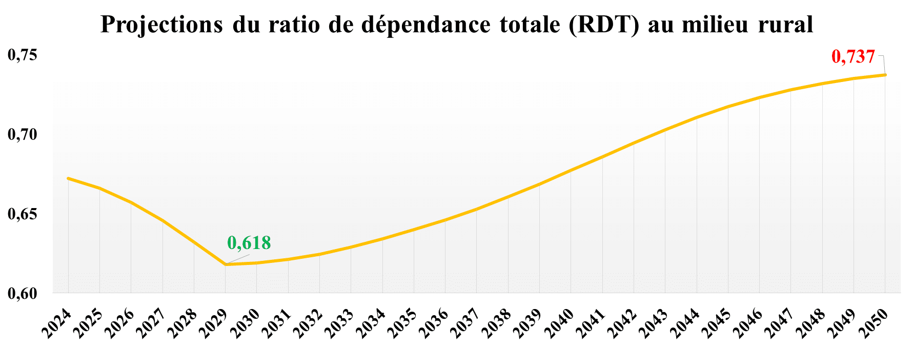 En 2050, le milieu rural comptera 74 personnes inactives pour100 personnes activesL’analyse des dividendes démographiques au milieu rural de 2024 à 2050 révèle une période initiale favorable, avec une diminution progressive de la charge des dépendants atteignant 61,8% en 2029.