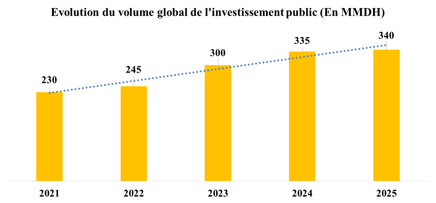 Le volume d’investissement public prévu pour 2025, tel que détaillé dans le projet de loi de finances (PLF), s’élève à 340 MMDH, en hausse de 5 MMDH par rapport à 2024.