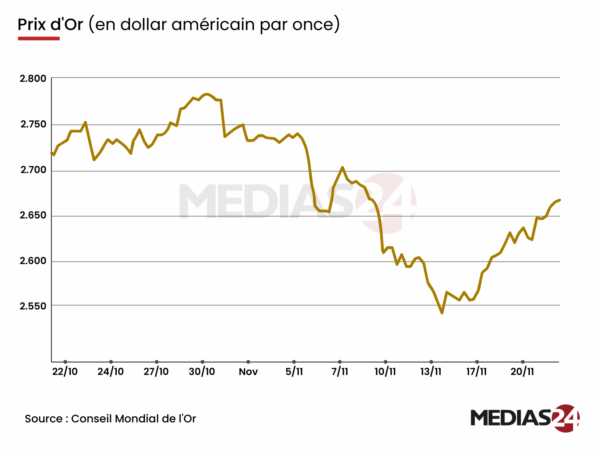 Au Maroc, après avoir atteint des sommets inédits en septembre, le prix de l’or a légèrement reculé, notamment en raison d’un boycott des bijoutiers. Au 21 novembre, le prix brut s’élève à 740 DH le gramme, marquant une divergence notable par rapport aux cours internationaux. Cette situation interpelle, car les fluctuations des prix internationaux devraient théoriquement se refléter rapidement sur le marché marocain.