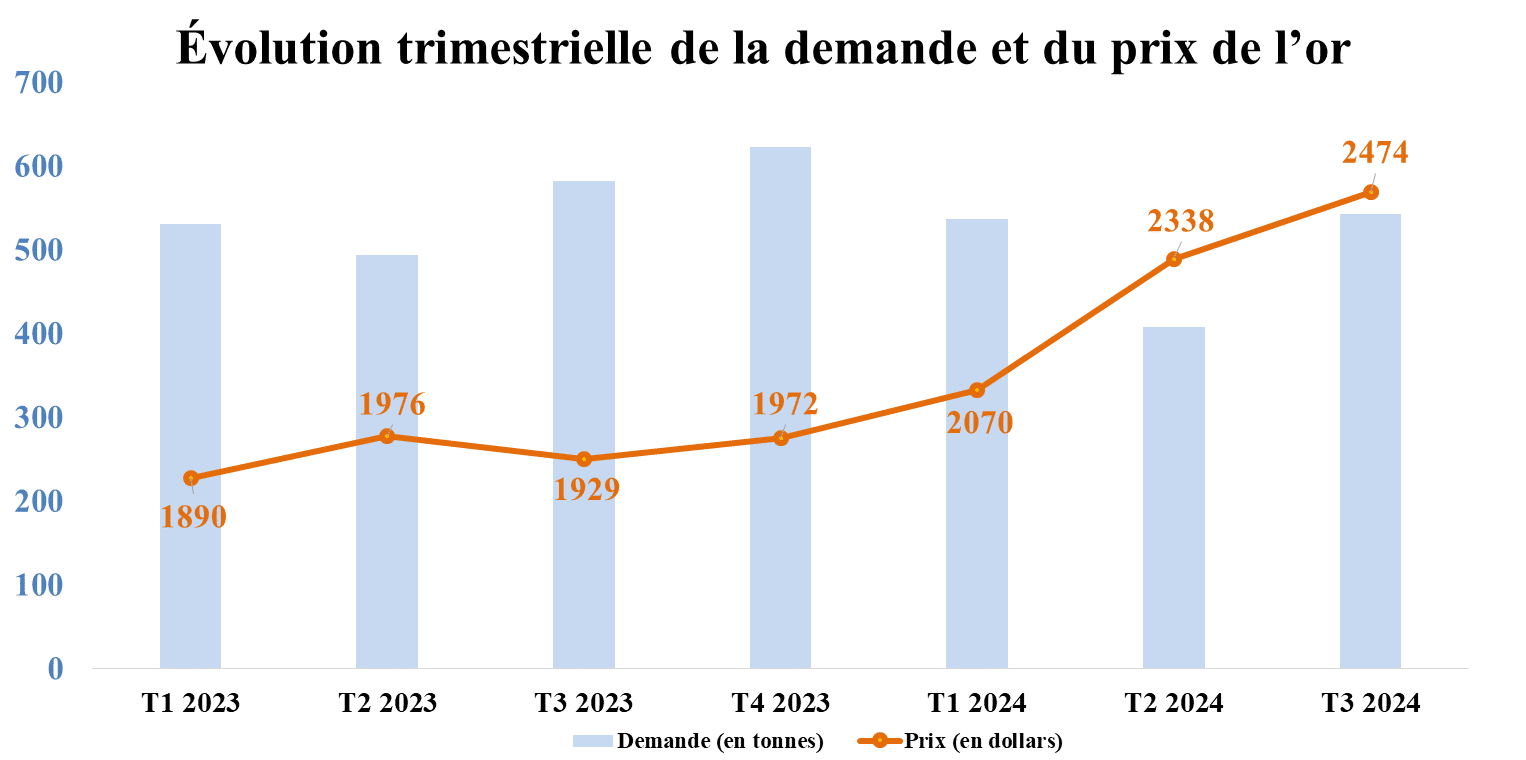 Le graphique ci-dessous met en évidence cette tendance exceptionnelle, montrant une augmentation de la demande au T3 2024 par rapport au T2 2024, et ce, malgré une hausse notable des prix. Une performance qui souligne l’attractivité remarquable de l’or dans un contexte économique et géopolitique incertain.