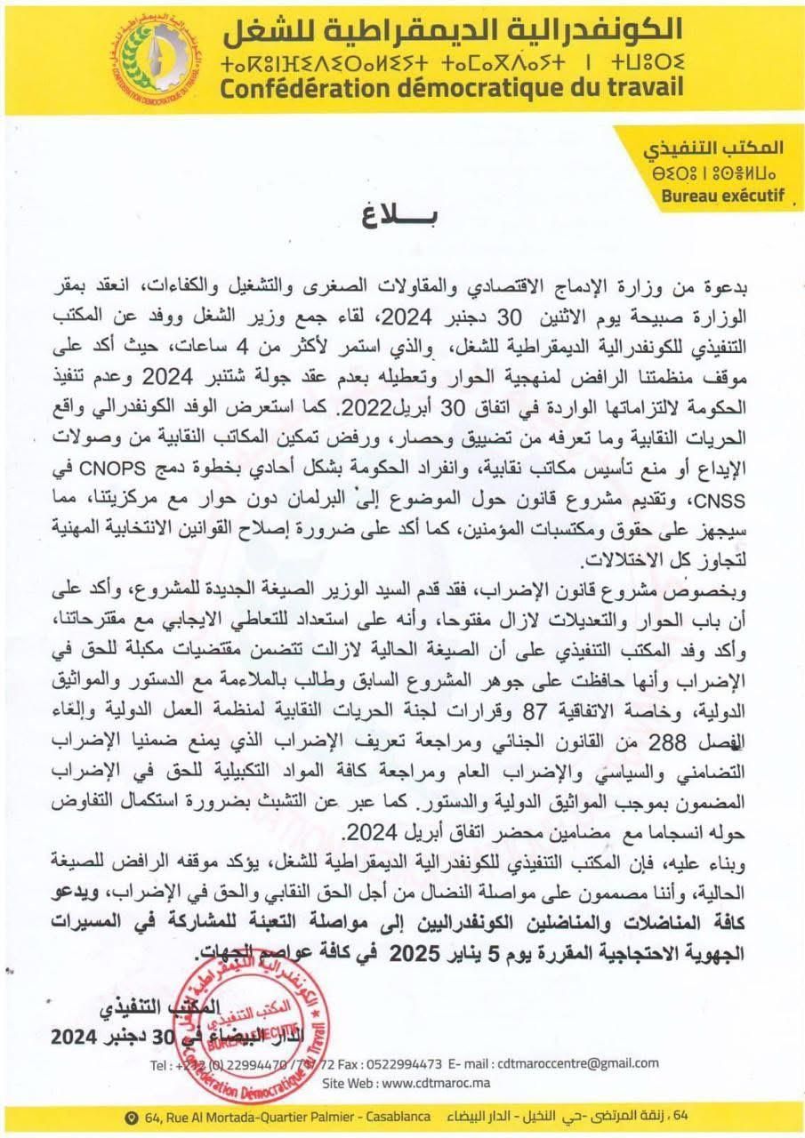 Lors d'une rencontre tenue le lundi 30 décembre 2025, sur invitation du ministre en charge du Travail, ayant duré plus de 4 heures, la CDT a fait part à Younes Sekkouri de sa position maintenant sa grève prévue le 5 janvier.