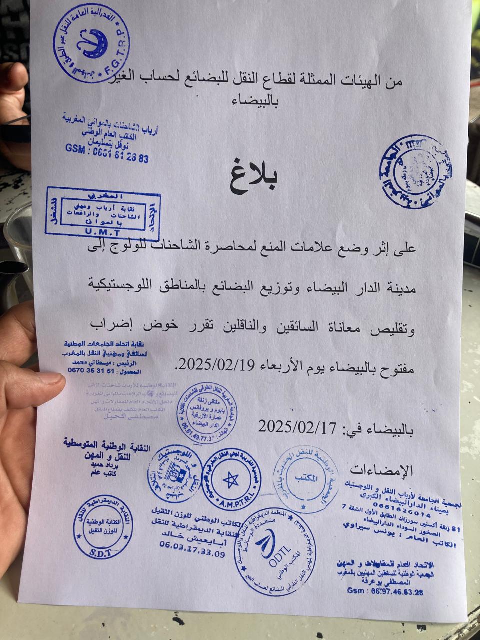 Des panneaux interdisant aux semi-remorques d'emprunter plusieurs entrées de Casablanca sont apparus, empêchant l'accès de la ville aux transporteurs sauf par le corridor de Aïn Sebaâ en direction de Casa-Port. Les instances représentatives du secteur ont protesté en menaçant de faire grève. Une réunion est prévue ce mardi 18 février avec les autorités.